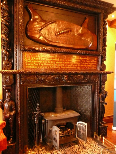 By the second half of the 18th century, the flitch was symbolic – a picture carved into the wood above the fireplace, in the main hall. Apparently it still hangs there, as can be seen on this photo, found on ladyJake’s Flickr photostream, which she has kindly given me permission to use here.