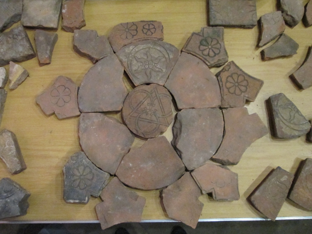 Karen explained that she had found a few of the tiles we found mentioned in reference books and that they had been found at Much Wenlock, Polesworth and the tile with the Fleur de Lys which has a ‘special squiggle’ on it had been recorded at Lichfield Friary and Karen had also seen a photo of it taken at Lichfield Cathedral Library. Karen had even searched all the tiles held at the British Museum to look for the patterns too. Some of the patterns she still could not find, maybe they only existed at the Lichfield Friary?