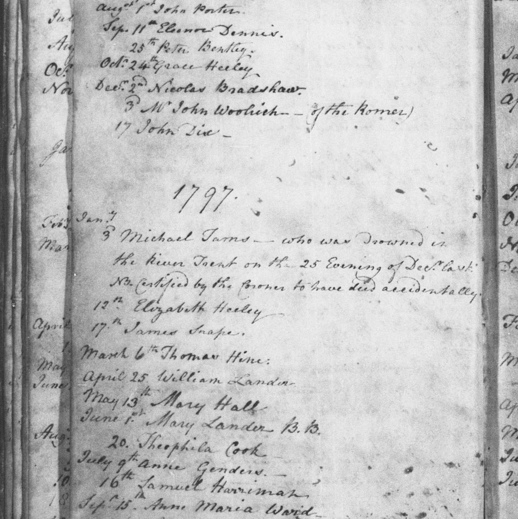 The All Saints parish register has the entries for Mr Brian Ward’s burial on 23rd February 1809 and five year old Anna Maria Ward’s burial on 15th September 1797. Neither has a note attached to suggest there was anything unusual or untoward about their deaths. I’m sure that had there been, the Vicar of Sandon would have included something as above the entry of Anna Maria’s is a record of the burial of Michael Tams supplemented to say he was drowned in the River Trent on the 25 Evening of December.