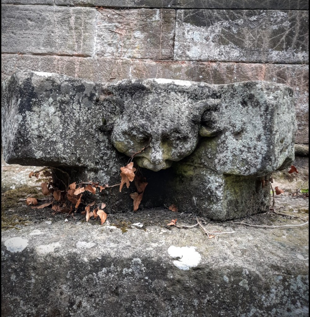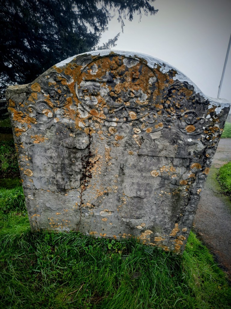 I love a tomb with a tale attached and the churchyard at Sandon delivered. An article in the Staffordshire Sentinel in December 1955, talks of, ‘a grave, said to be that of a highwayman who met his death at Sandon. Certainly the curious shape of a horse and rider on the gravestone would bear out this legend’. A misty winter’s morning, in the dead days of last December, provided the ideal conditions to seek it out and, as the fog swirled around our feet, we found it. Sadly, those curious shapes are now encrusted with lichen and much-weathered by the sixty-nine winters which have passed since the description in the Sentinel was published.