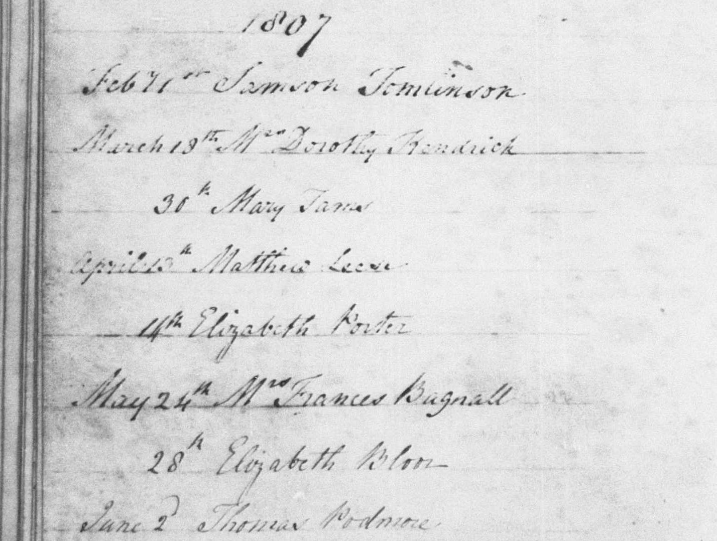 What I can’t find in the Sandon register is a record of the burial of Ann Ward in 1807. In fact, I can’t find any record of her burial at all.
